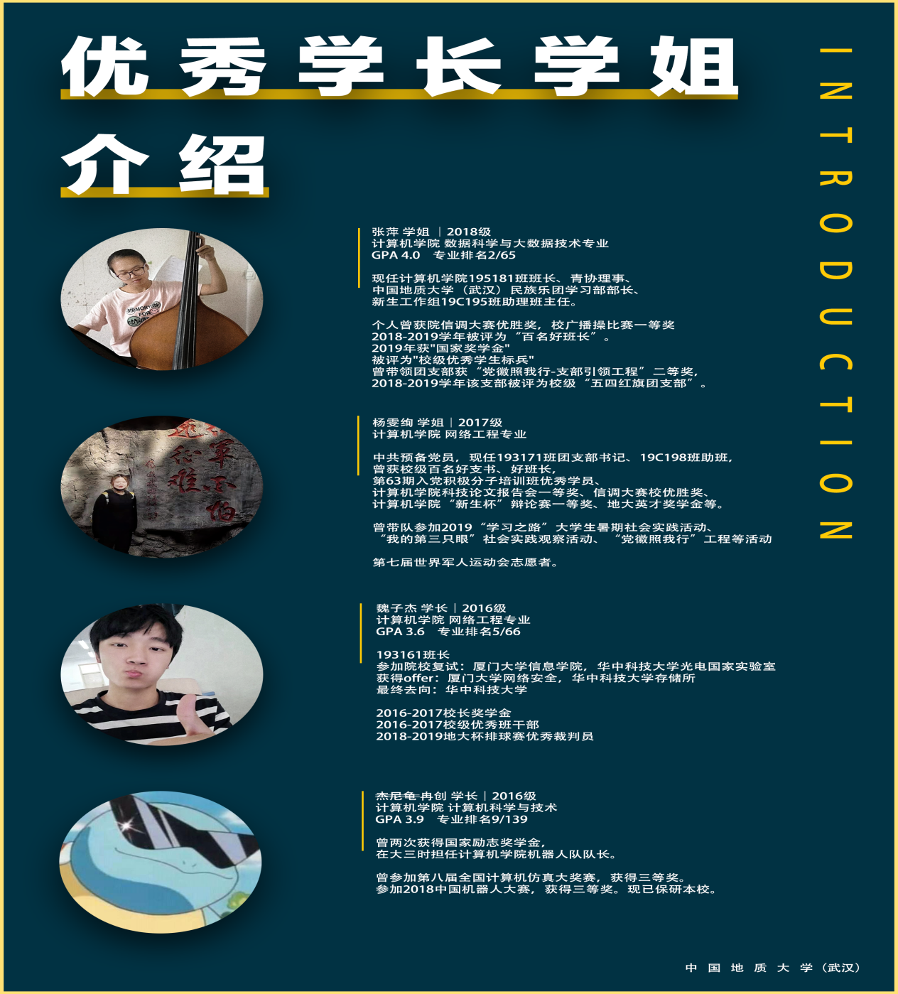 接下来是16级网络工程专业魏子杰学长,魏子杰学长学分绩点为3.6,专业排名第五,担任193161班班长,参加了厦门大学信息公司和华中科技大学光电国家实验室的复试,并获得了进入厦门大学网络安全和华中科技大学存储所的保研资格,最终保研华科;他2016-2017学年获得董事长奖学金,“校级优秀班干部称号”,2018-2019学年被评为“地大杯”排球赛优秀裁判员。