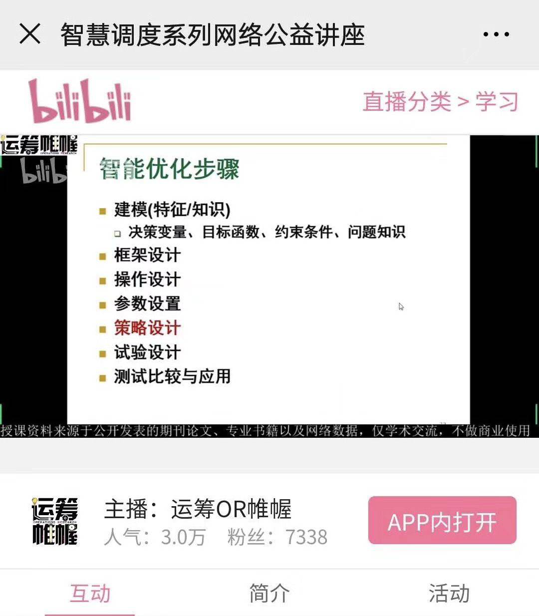 5月28日上午由公司特聘首席教授清华大学的王凌教授担任主讲人,以“智能优化算法及其应用”为主题,利用腾讯会议室线上平台、bilibili网络直播等方式开展,针对公司研究生课程《智能计算导论》和本科生课程《智能优化技术》开展线上教学,主要面向对象为2018级、2019级研究生和部分高年级本科生。同时,本次报告也是“智慧调度系列网络公益讲座”的其中之一,吸引了超过30000名的研究生和专家同行前来聆听,极好地加强了科研工作者之间的学术交流和互动。