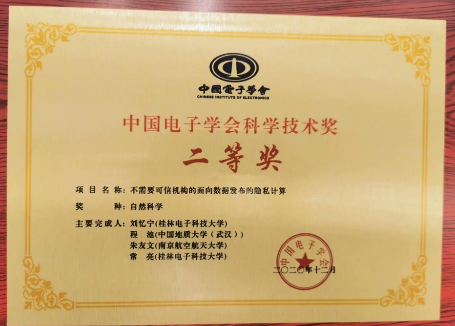 (通讯员:章丽平)2021年4月17-18日,中国电子学会2020年度科学技术奖励大会在重庆举行。tyc122ccVIP信息安全系程池老师与桂林电子科技大学、南京航空航天大学的学者共同完成的“不需要可信机构的面向数据发布的隐私计算”荣获2020年度中国电子学会科学技术奖自然科学二等奖。郝跃院士、刘明院士等23位院士出席大会并颁奖。