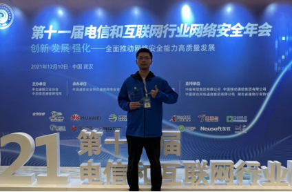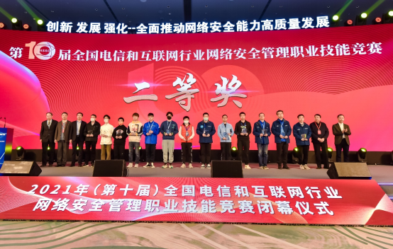 竞赛闭幕仪式暨颁奖礼在“2021年(第十一届)电信和互联网行业网络安全年会”主论坛上举行。工业和信息化部网络安全管理局局长隋静、湖北省通信管理局局长吴俊、中国国防邮电工会全国委员会副主席黄敬平、中国信通院副经理魏亮、中国通信企业协会副秘书长赵俊湦出席闭幕仪式并致辞。来自全国31个省、自治区、直辖市通信管理局、省通信行业协会、基础电信运营企业、互联网企业、网络安全企业和科研机构、高等高职院校等相关单位的领导和代表以及参赛选手近400人参加闭幕式。