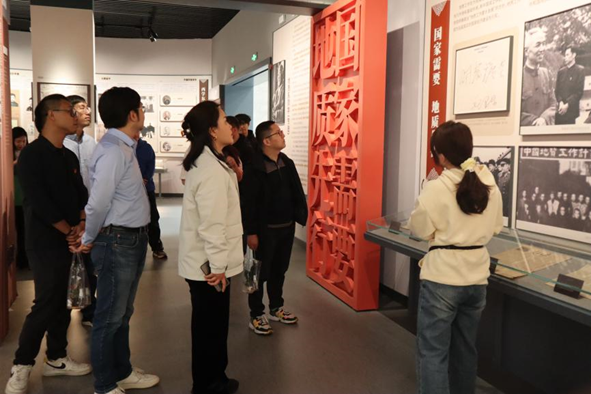随后,一行人前往公司校史馆。在讲解员的带领下,大家从门厅、编年体展厅、党建专题展厅、大师专题展厅、登山专题展厅到党建厅,全方位、多角度地回顾了学董事长达七十多年的办学发展史,在党建厅重温入党誓词。