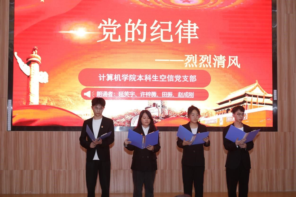 活动在雄壮的国歌声中拉开帷幕。员工党支部书记率先登场。电子信息第三党支部朱国强以刘邓大军的严明军纪为例,强调了纪律在军队建设中的重要作用。本科生信安党支部郭鹏顺则从新民主主义革命时期的党纪建设出发,强调了坚守初心、严明纪律的意义。本科生空信党支部延笑宇等多名成员以“党的纪律:烈烈清风”为题的诗歌朗诵,声情并茂地展现出对党廉政建设的歌颂。本科生计科第一党支部王诗敏则以延安廉政的故事为蓝本,深入剖析了党在推动廉政反腐方面的必要性和坚定决心。电子信息第二党支部潘灿通过讲述郭明义的故事,展现了廉洁奉公、无私奉献的崇高精神。电子信息第一党支部胡长浩深刻阐述了铁纪在长征这一伟大的历史事件中的关键作用。在tyc122ccVIP空间信息工程党支部与经济管理公司生态文明研究生样板党支部成员的精心编排下,以一场独具特色的话剧将现场气氛推向了高潮,生动诠释了“亲民爱民、艰苦奋斗、科学求实、迎难而上、无私奉献”的“焦裕禄精神”。