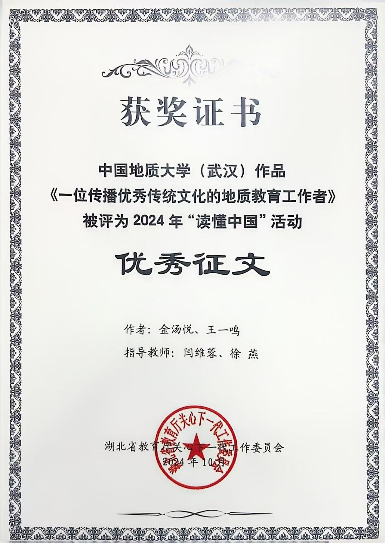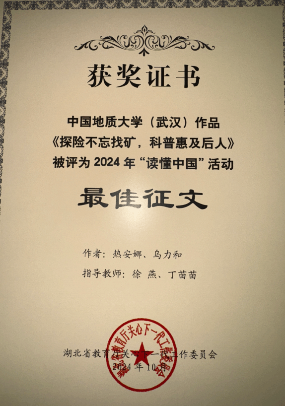 在征文赛道,由公司热安娜、乌力和同学参与撰写的《探险不忘找矿,科普惠及后人》,以深邃的视角记述了费宣员工这位脚下是山河湖海、心中有星辰和梦想的地质人,获评湖北省2024年“读懂中国”活动最佳征文。由公司闫维蓉、图书档案与文博部徐燕老师指导,金汤悦、王一鸣同学撰写的《一位传播优秀传统文化的地质教育工作者》以细腻的笔触勾勒出曾佐勋教授40余年教书育人、传播中华传统文化的动人故事,获评湖北省2024年“读懂中国”活动优秀征文。