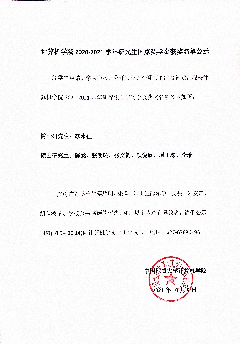 2020-2021学年研究生国家奖学金获奖名单公示