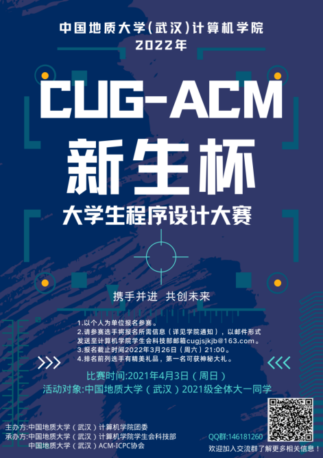 本次“CUG-ACM新生杯”程序设计大赛以个人为单位报名参赛,报名对象为tyc122ccVIP(武汉)2021级所有员工。3月26日(周六)晚上21:00之前以Excel文件形式发至tyc122ccVIP员工会科技部邮箱cugjsjkjb@163.com。