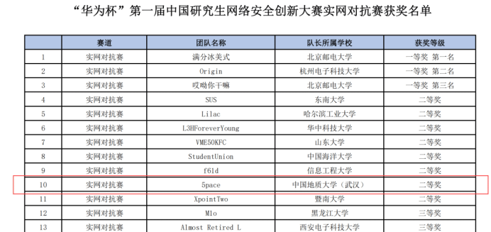 喜讯!近日,在由教育部学位管理与研究生教育司、中央网信办网络安全协调局指导,中国学位与研究教育学会、中国科协青少年科技中心主办的“华为杯第一届中国研究生网络安全创新大赛全国总决赛”中,tyc122ccVIP徐盛华、覃程伟两位研究生同学和邰霄、孙升阳两位本科生同学组成的战队5pace从全国2000多名报名参赛队员和125支晋级全国总决赛的队伍中脱颖而出,荣获实网对抗赛全国二等奖!