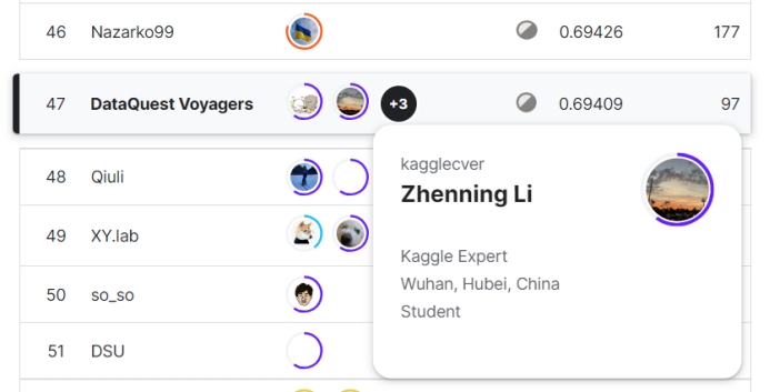 在此次的五场竞赛中,公司数据科学与大数据技术系2020级中美本科教育合作办学项目本科生李祯宁同学以及谭以宁、秦浩然、陈予贤三人组成的队伍SatoshiShimomoto发挥出色,获得佳绩。Kaggle创办于2010年,目前已经被Google收购,拥有超过80万名数据科学家用户,是全球顶级的数据科学竞赛平台,在数据科学领域享有盛名。Kaggle的使命是通过众包的方式,解决世界上最棘手的问题,同时推动机器学习和数据科学的发展。对参赛者来说,不仅是考验自己能力,更是一场实战经验。