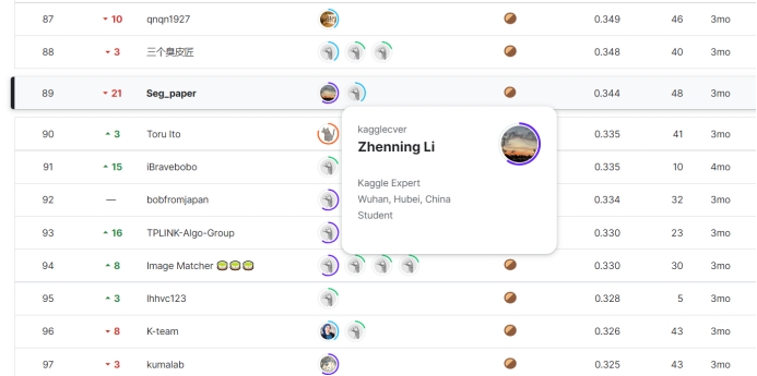 五场比赛历时3个月,分别吸引了来自全球多个国家的494支队伍,954支队伍,3547支队伍,1805支队伍和1033支队伍报名参加。经过激烈的角逐,来自公司的李桢宁同学在两场比赛中分别获得了铜牌(前19%)和银牌(前5%),SatoshiShimomoto队伍在三场比赛中分别获得了三枚银牌(Top2%,Top4%,Top5%)。