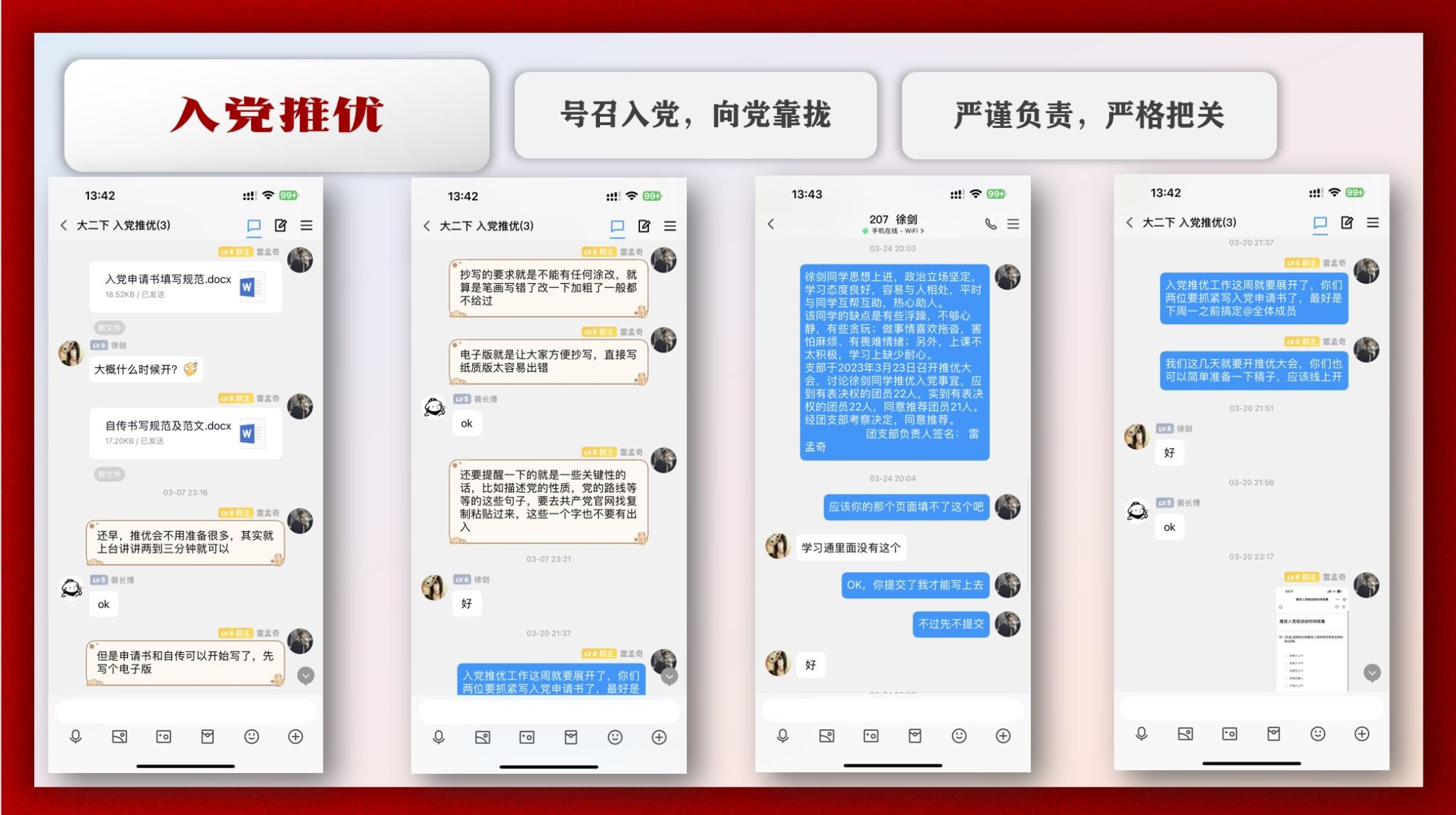 中国共产党和中国共青团的鲜艳红色是191212班积极进取的青春底色。在青年大学习中,191212班采用分组学习的方式,始终把红色思想的弘扬落实到底。从团支书、到组长、到组员环环监督,191212班总是把学习率锁定在公司前列。在入党推优中,191212班秉持公平公正公开的原则,严格审批把关,激励每一位同学早日入党。191212班已有14位同学参与入党推优,3位预备党员。在2023年的五四评优中,191212班以第一名取得了校级五四红旗团支部的荣誉称号。