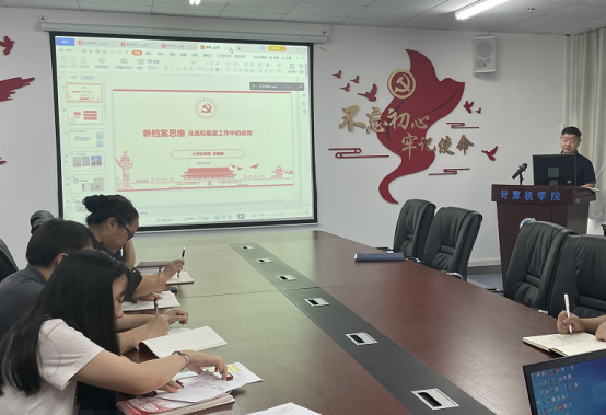接下来,李国昌以“新档案思维在高校基层工作中的应用”为题,通过生动的表述和深刻的剖析,分享了工作中运用新档案思维的感悟和启发。他指出,与传统的一系列围绕有用记录收集、整理、保护、开发利用反应过程的档案思维相比,创造信息和记录的新档案思维对于推动个人进步、单位发展和社会前进具有重要的指导作用,我们每个人都是供他人、后人学习和评说的“活档案”,应致力于创造更多的有用信息和记录,经得起历史和后人检验。我们要围绕立德树人这一个中心,增强问题意识、目标意识、质量意识、道路意识,坚定专业自信、队伍自信、质量自信和院本文化自信,强化被动化向主动化、碎片化向系统化、临时化向常态化机制化、单兵化向团队化、记忆化向档案化的五个转变,选准精课、精专、精师、精才、精品的切口,抓住科技创新、课程思政、教师工作室开放、师生联谊和国际合作五大特色。他用习总书记提出的“干在实处永无止境,走在前列要谋新篇,勇立潮头方显担当”浙江精神勉励大家,在岗位上发挥育人的价值勇于善于乐于做无名英雄,在事业发展中成就自己。