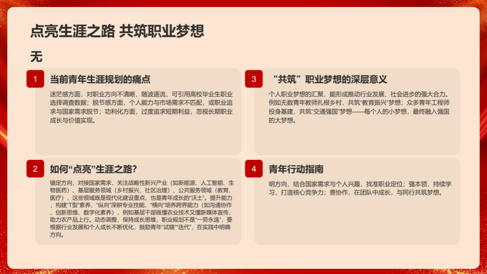 “点亮生涯之路”板块直击规划痛点,姜宇给出针对性方案。冉文辉同学分享:“此前对职业方向迷茫,现在知道要对接国家重点领域,构建‘T型’素养,精准提升能力以契合市场需求。”
